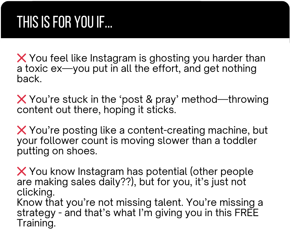 A stacked 60-minute masterclass revealing how I grew from 0 to 101K followers in 9 months & built 10 income streams from Instagram (without spending hours engaging or dancing in Reels).